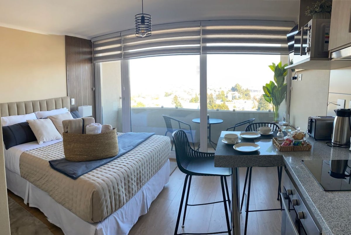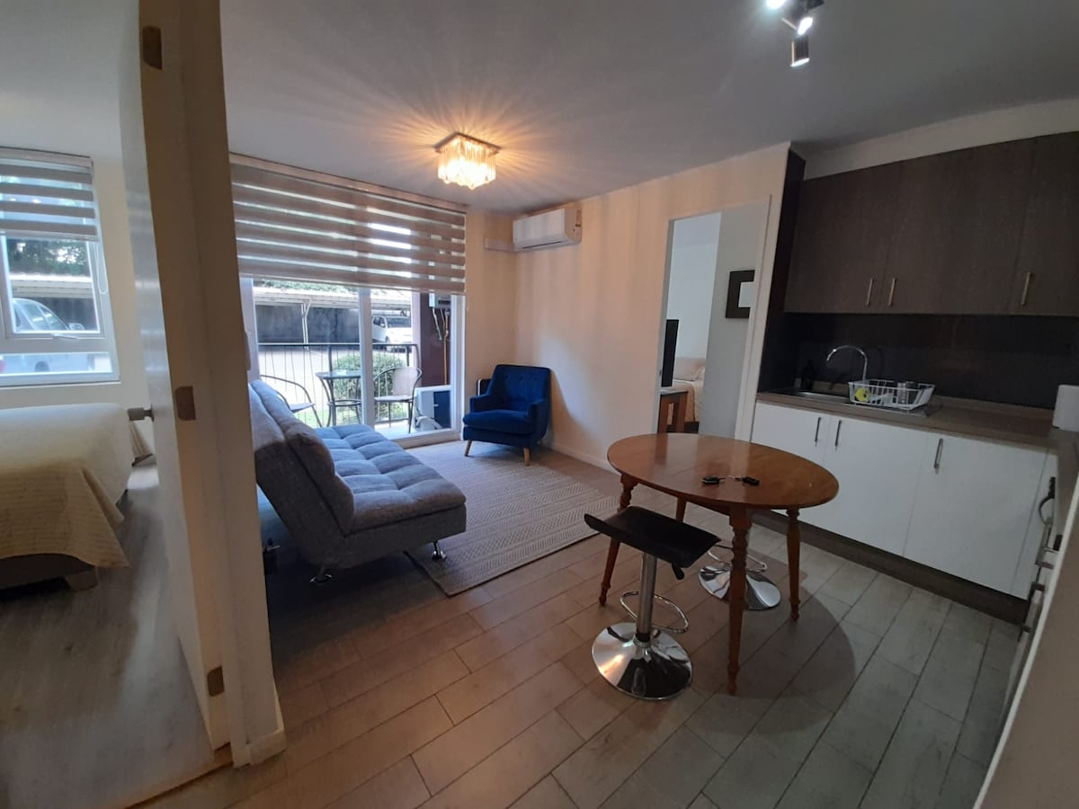 Hola 👋 mi nombre es Paz 🙋♀️ que gusto tenerte por acá 😊 te informo que te vas a hospedar en una zona residencial en el centro de Chillan 👏😎 Depto 2 personas Cuenta con cama (2 plazas), 2 almohadas, 2 toallas, lámpara, velador, desayunador (2 personas), cocina encimera, campana, horno eléctrico, microondas, frigobar. Este departamento se encuentra ubicado en pleno centro de la ciudad de Chillán exactamente en calle Independencia 150 (entre calles Gamero e Itata) Ojo: Sin estacionamiento.