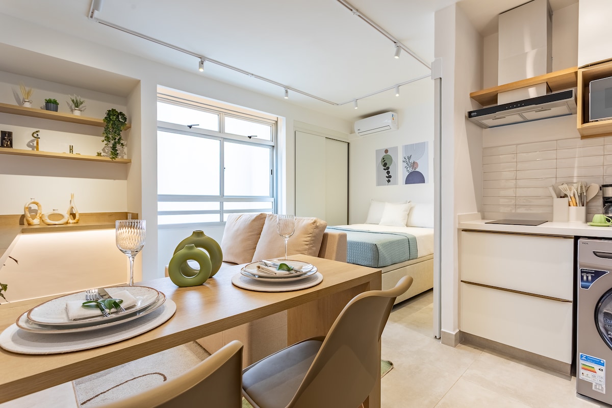 Nosso espaço conta com design moderno para que nosso hóspede viva uma experiência marcante na Capital Federal. O studio possui cozinha americana completa com utensílios e eletrodomésticos. Dispomos de ar condicionado split, smart TV , internet de alta velocidade, banheiro , iluminação confortável, escrivaninha com cadeira, guarda roupa, cama tamanho padrão,colchão confortável, roupa de cama, toalhas de rosto e banho, check-in facilitado. A 2 minutos para o Parque e também para o centro clínico.
