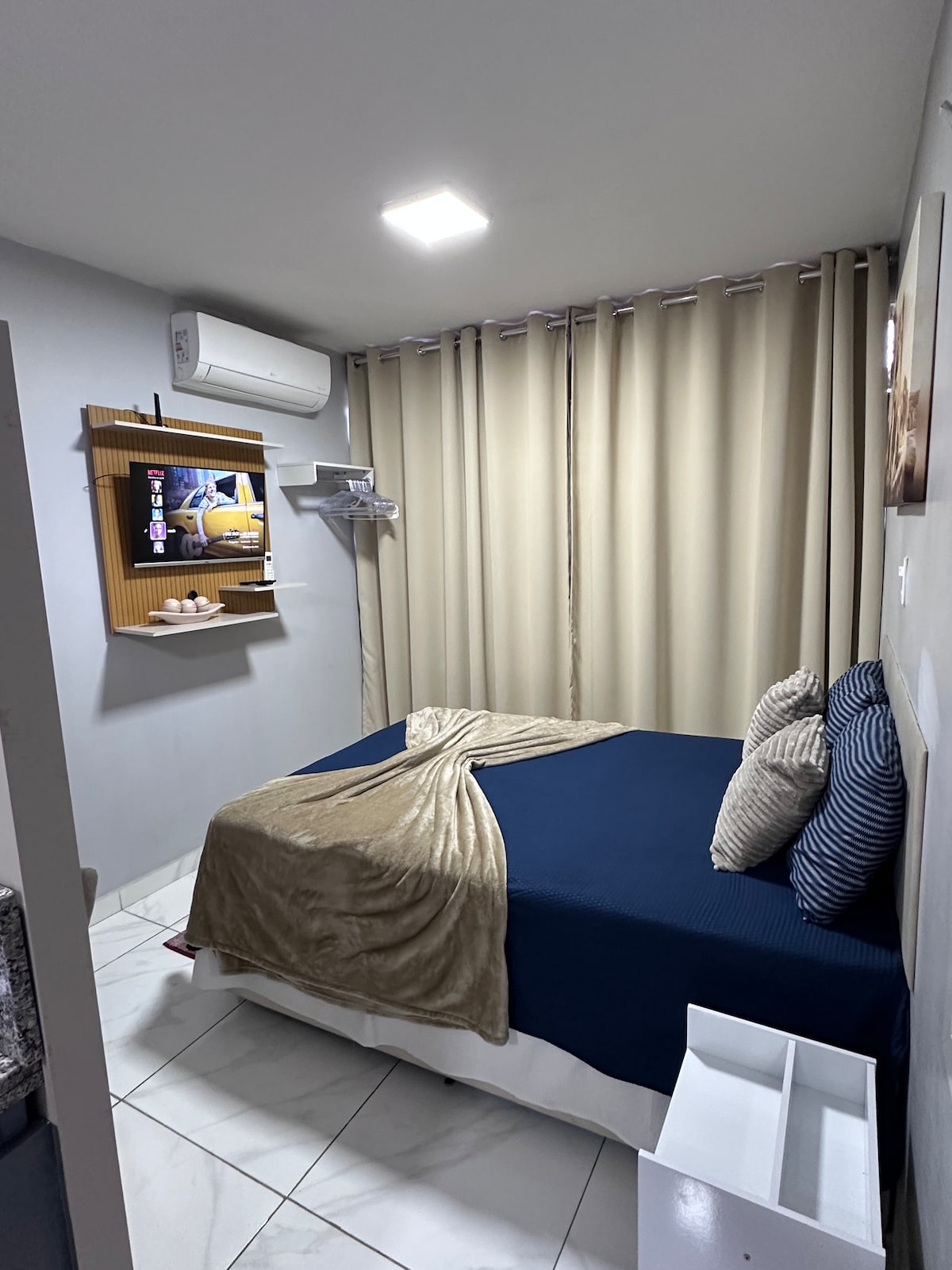 Espaço recém reformado, com copa, quarto e banheiro, para ate 03 hospedes, ótima localização, de frente pra reserva florestal, com pista de caminhada, ar condicionado inverter , wifi, smart tv, netflix, geladeira, microondas, camas box, lençóis de algodão, cortina blackout, cabideiro com cabides. Distante a 08 minutos do aeroporto e 05 da rodoviária e parkshopping. Padaria, mercado e farmácia próximos. Localizado na Candangolandia DF.