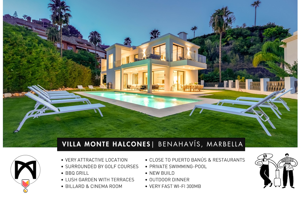 ✨ An architectural masterpiece built in 2023, perched on the hills of Benahavís with breathtaking views over the Golf Valley and the Mediterranean 🌊 This 6-bedroom villa is a playground for luxury, with a private swimming pool, a tropical garden, and a massive basement entertainment hub with billiards, arcade games, and a private cinema 🎬 Located just 8 minutes from the vibrant Puerto Banús 🛋️🌅 🦅 Villa Monte Halcones: Managed by Vacation Marbella, the largest holiday rentals in the region.