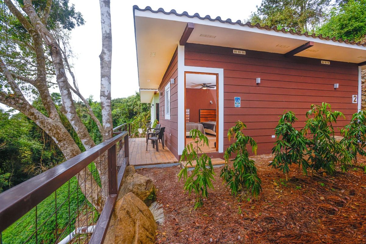 Esta cabaña es moderna y llena de Naturaleza. La cabaña está a 5 minutos antes de llegar al Valle de Antón, tiene un solo espacio donde están las camas, cocina y desayunador. Afuera hay una terracita con una linda vista para disfrutar. Tiene TV , cafetera y estufa eléctrica sin horno. Los últimos 3 minutos del camino hay una calle de piedra, pero un Picanto pasa sin problemas. Se permiten hasta dos perros pequeños. Check in 3 pm y Check out 12 md.