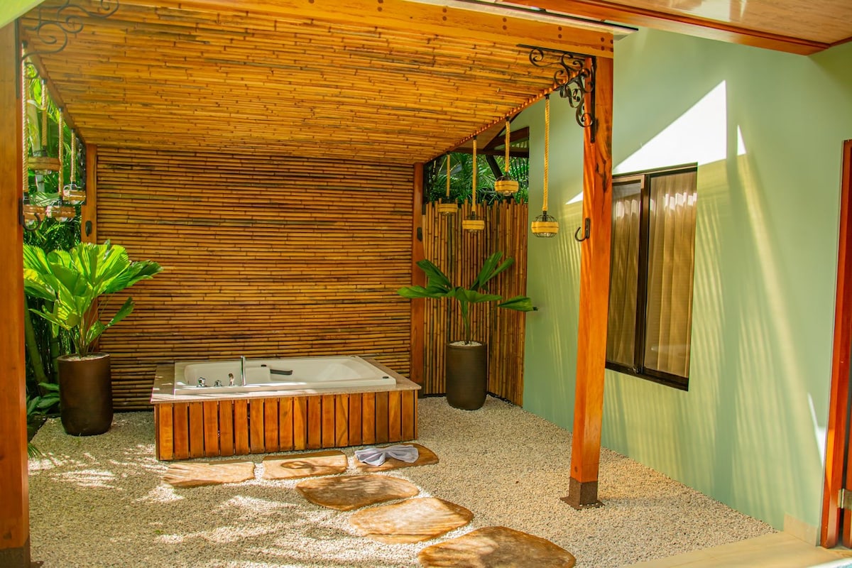 Relájate y desconecta en este alojamiento tranquilo y elegante, casita con jacuzzi privado, cocina equipada, internet de alta velocidad, hermosos jardines, fantástica vista al volcán arenal con puesta al sol, lugar privado. Piscina con agua temperada hermosa cascada deck y sillas de playa. De seguro querrás regresar nuevamente. Contamos con un Generador eléctrico para nunca tener ausencia de energía eléctrica.