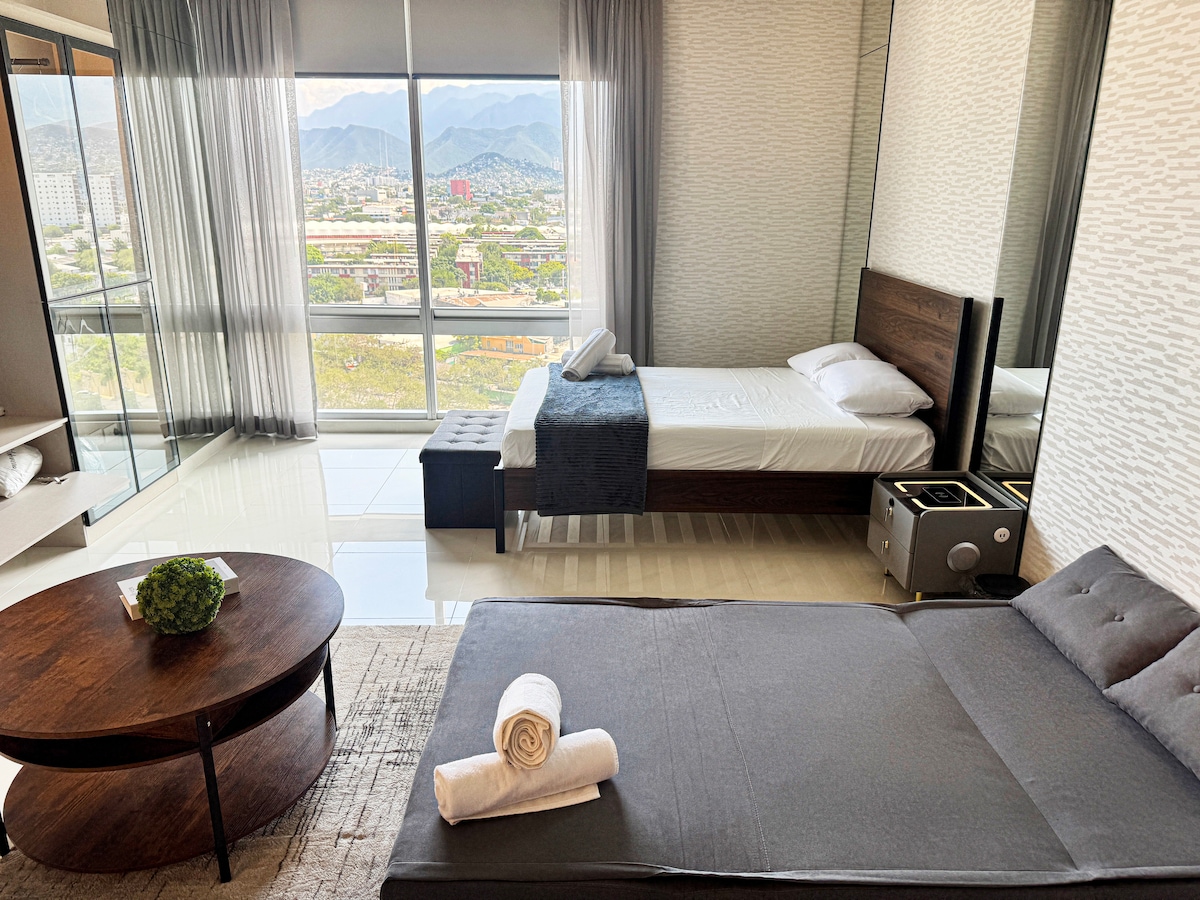 Hermoso desarrollo ubicado en la zona sur de la ciudad de Monterrey. A unos minutos de Plazas comerciales como: Pueblo Serena, Esfera y Omnia. A 5 minutos de TEC de Monterrey, a 3 min de UANL campus Mederos, 3 min hospital Muguerza sur en auto y 5 min caminando vitapista del rio la silla. Amplias áreas verdes con alberca Suite 100% remodelada con electrodomésticos nuevos e incluye Netflix Ven y disfruta de una gran estadía en este bello lugar.