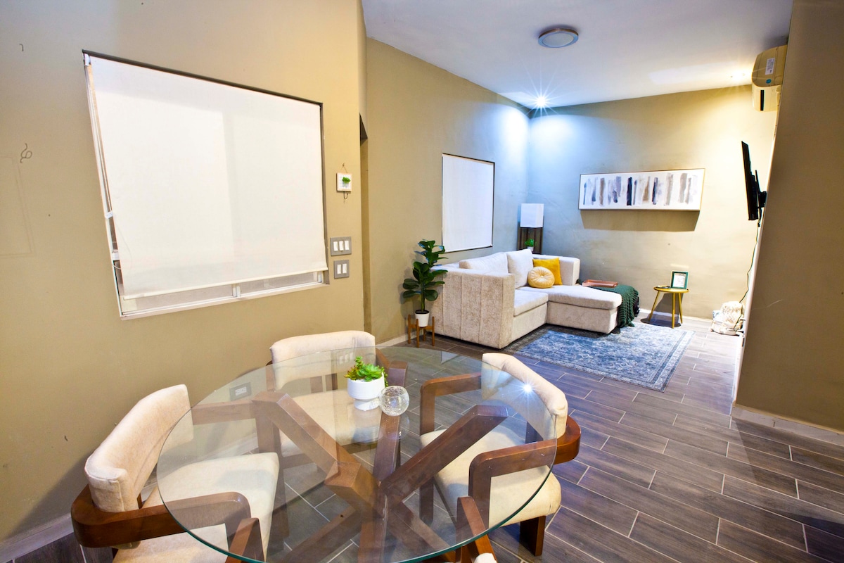 Departamento de 1 recamara, 1 baño, sofacama, cama individual plegable muy cómoda, cocina de cuarzo equipada, centro de lavado, coffee bar con sus respectivos insumos, WiFi, balcón con vista hacia parque Fundidora y la Arena Monterrey. Cuenta con Gimnasio, Area al aire libre, salón de juegos, espacios co-work y asadores (este último se reserva por una módica cuota de limpieza). A pasos de los mejores atractivos en Monterrey. Ahorra tiempo y dinero hospedándote en Depa Arena y Fundidora!