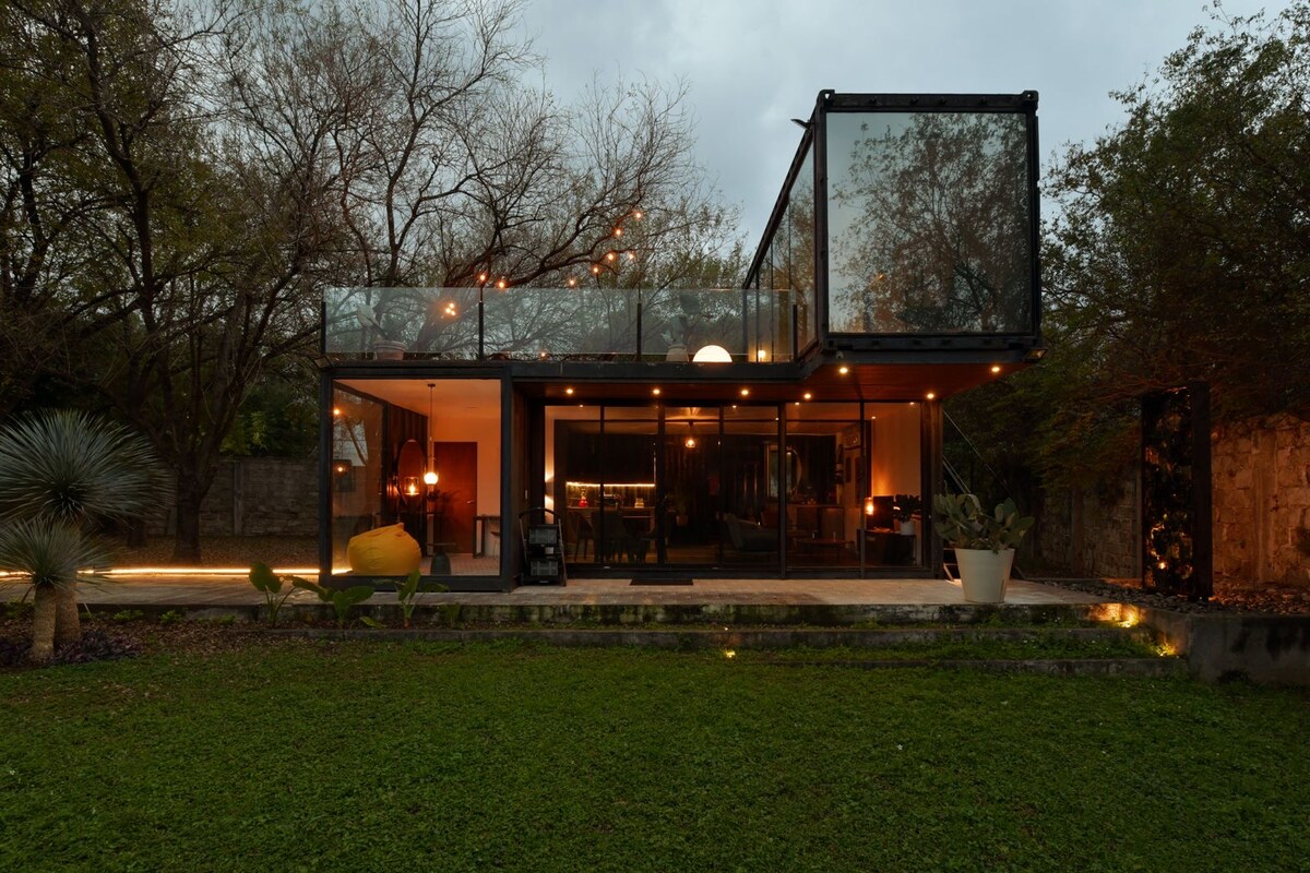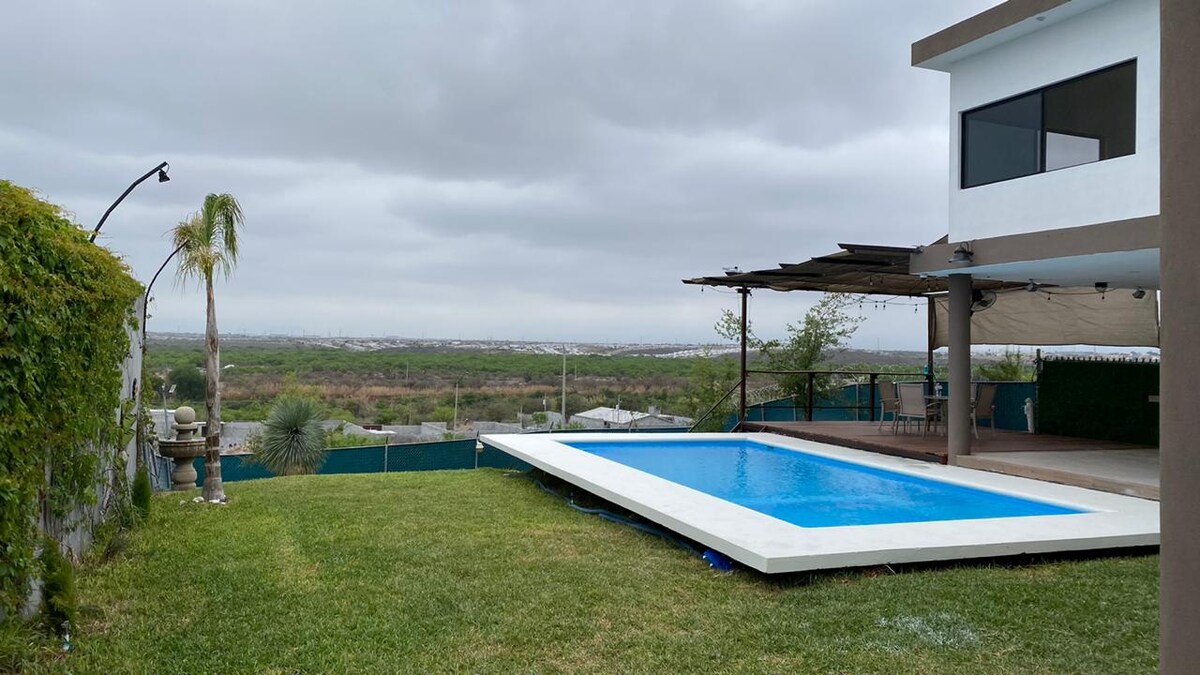 Estilo industrial (climatizada)para disfrutar en familiar y amigos. vista espectacular a las montañas, amplia terraza y bellísima alberca. Max 6 huéspedes, no invitados, niños pequeños y bebés cuentan como extras.. ideal para GEATTING READY asador, portón eléctrico, bardeada, malla electrificada, subes tu vehículo a la altura de la terraza y así el acceso a discapacitados. Máx 2 mascotas a 2 km de la carretera y 400 mts de terracería, a 8 min de pueblo mágico Santiago. Solo música ambiental