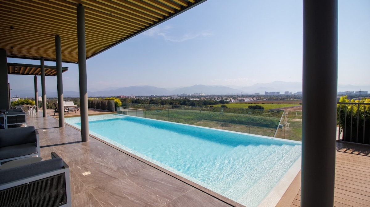 Discover the amazing pool Aria has with ocean views and yet more extraordinary the pool located in the beach surrounded by sand - the only one in Vallarta. Enjoy of this new unit on the new building of Aria with fantastic views from the 10th floor to the jungle and golf course. Have lunch or a few drinks with the bar service by the pool for you only to enjoy the great sun and weather Vallarta offers all year. Well equipped and fast wifi for your longer stays.