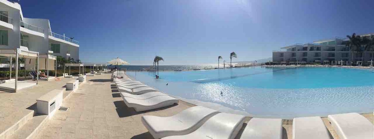 Departamento nuevo de Lujo, a pie de playa en Nuevo Vallarta. impecable,. Disfruta una de las mejores playas , hermosas puestas de sol, Restaurante, 2 Albercas infinita, otra alberca en la arena. Dos recamaras, 3 camas: 1 king 2 queen. A/A, 3 televisiones una de 70", microondas, secadora de cabello, cafetera, etc. dos terrazas. Muebles modernos. sábanas y colchas de algodón. (LAVADORA y SECADORA de ropa sin costo, solamente PARA RENTAS DE 6 NOCHES O MAS). estacionamiento para 1 auto