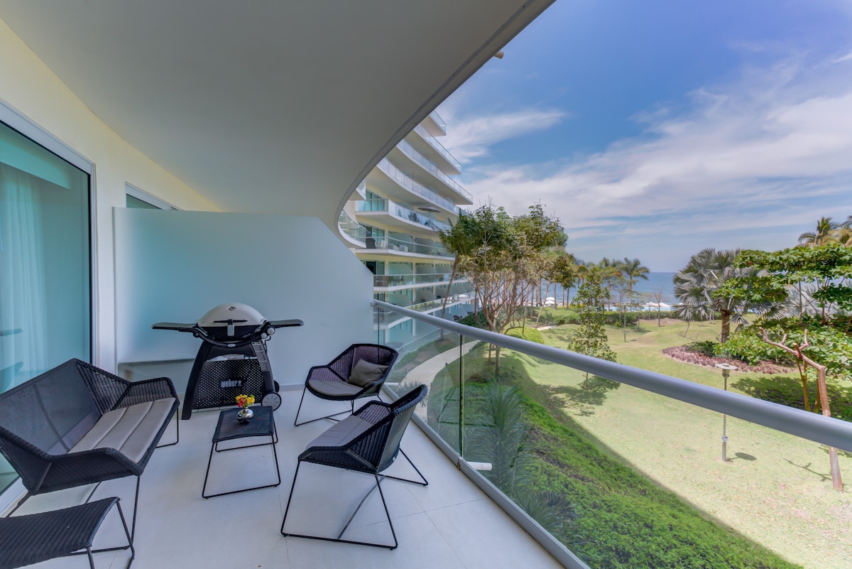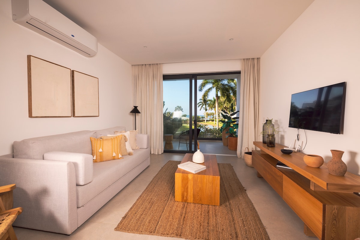 Increíble departamento en planta baja con una terraza privada y vista a un jardín. Áreas comunes muy bonitas con grandes jardines, espejos de agua y una espectacular vista al mar. El condominio esta frente a la playa. Tiene un área de playa privada y tranquila para una relajación total. Cuenta con una alberca Infinity y una segunda alberca a pie de playa. Un increíble lugar, alejado del bullicio de la cuidad, ideal para relajarte y descansar.