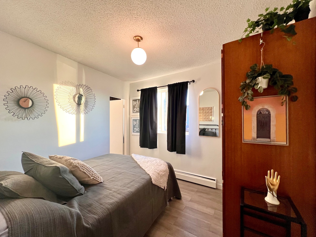 Located in the heart of Edmonton, this space is designed for comfort and beauty. Features include: WIFI (Netflix and Prime), King-sized bed with mattress topper, office area, kitchen, and balcony area. 100% non-smoking building with onsite management with parking available. Kick back and relax in this calm, stylish apartment in a 100% non-smoking building.