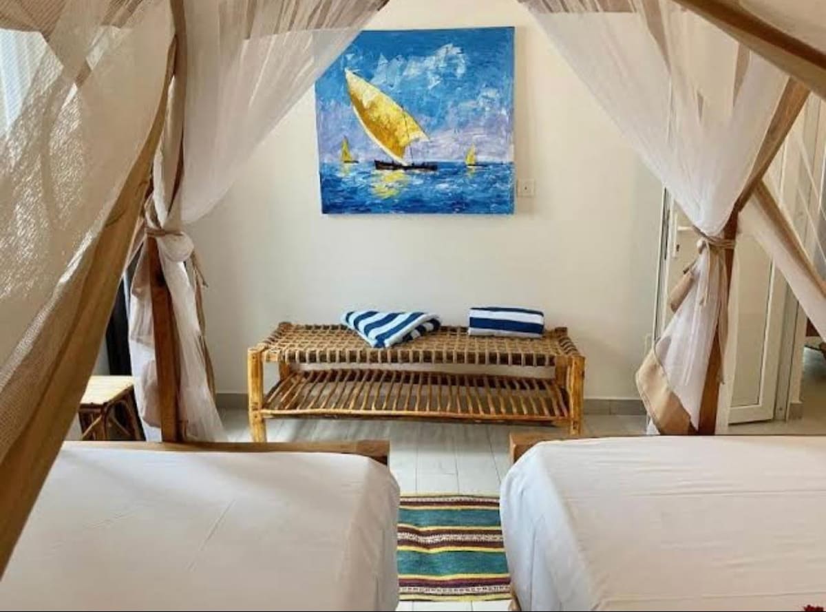 Cette chambre partagée est l’option parfaite pour les voyageurs à plus petit budget et curieux de découvrir la culture locale. Disponible pour une à cinq personne, vous serez situé au centre de Nungwi, à moins de 10min à pieds d’une plage paradisiaque, près de la rue principale comptant de nombreux restaurants et magasins locaux. Le logement offre l’essentiel pour un séjour simple et pratique, avec tout le nécessaire pour être à l’aise et opérationnel.