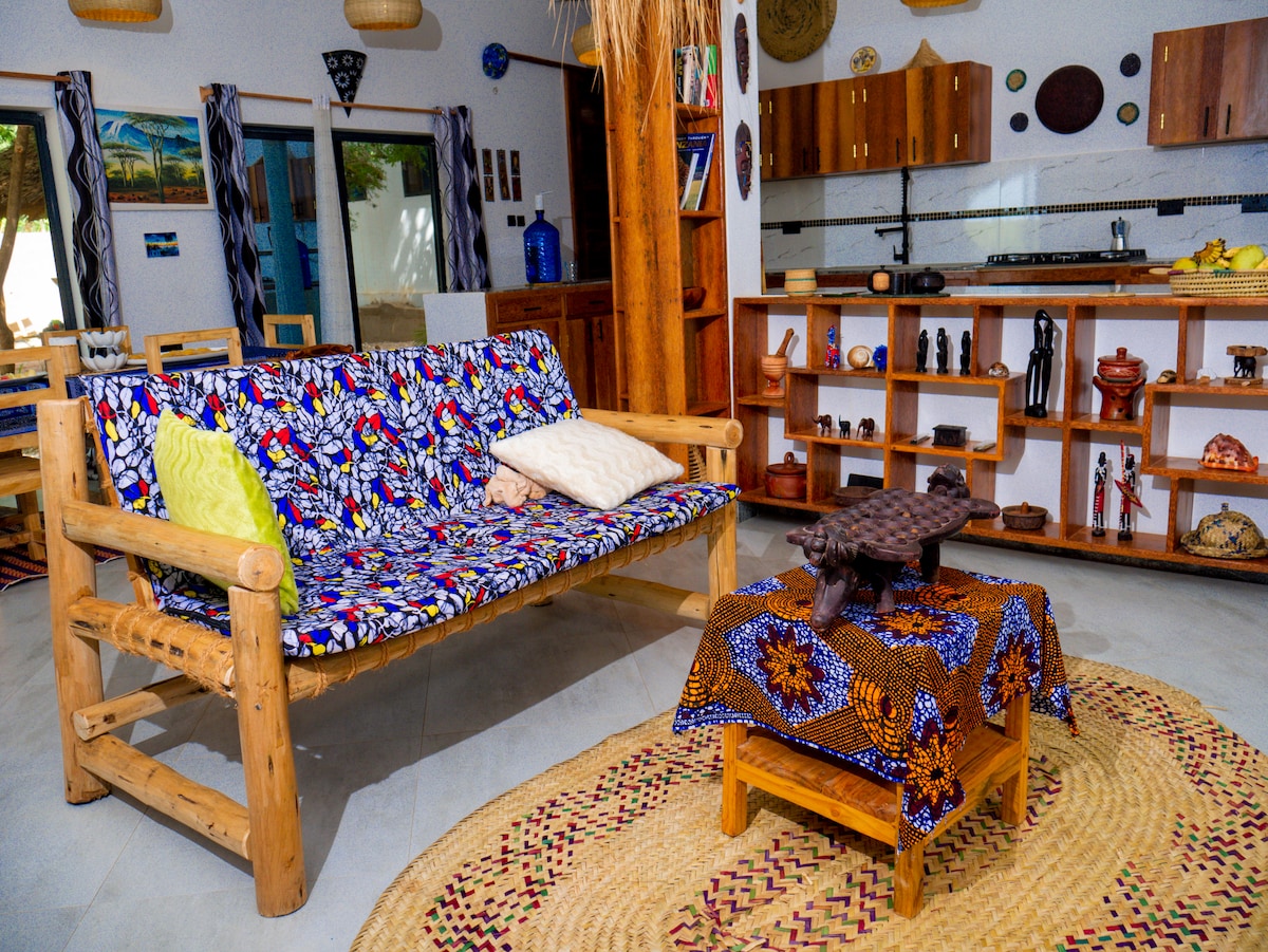 Wake up on the waterfront of the Indian ocean and a hot cup of coffee. Ocean to mouth eating fresh calamari-fish-crab, kayak to an island, watch sunsets, moon rises, bonfire evenings at waterfront restaurant/lounge. Lazy hammock days, rustic luxurious peaceful living, 6 star meals, not far from Kendwa/Nungwi. We live a simple life! This is not a luxury hotel, but a place to unwind and enjoy good company and nature. Welcome all travelers, families and couples. Breakfast is included.