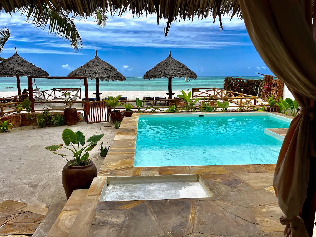 Wake up on the waterfront of the Indian ocean and a hot cup of coffee. Ocean to mouth eating fresh calamari-fish-crab, kayak to an island, watch sunsets, moon rises, bonfire evenings at waterfront restaurant/lounge. Lazy hammock days, rustic luxurious peaceful living, 6 star meals, not far from Kendwa/Nungwi. We live a simple life! This is not a luxury hotel, but a place to unwind and enjoy good company and nature. Welcome all travelers, families and couples. Breakfast is included.