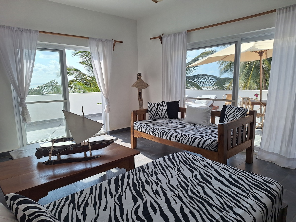 PROPERTY WITH BACK UP GENERATOR IN CASE OF ELECTRICITY CUT!Welcome to our beachfront apartment with Italian and Swahili style. It features a spacious kitchen, luxurious bedroom with king-size bed, ensuite bathroom, AC, private beach entrance, charming garden. Enjoy 24-hour internet, security, and a sofa bed for extra guests. Contact us for availability. Unforgettable stay guaranteed. Oh yes, we are now offering FULL BREAKFAST and COWORK ACCESS included in the price!!