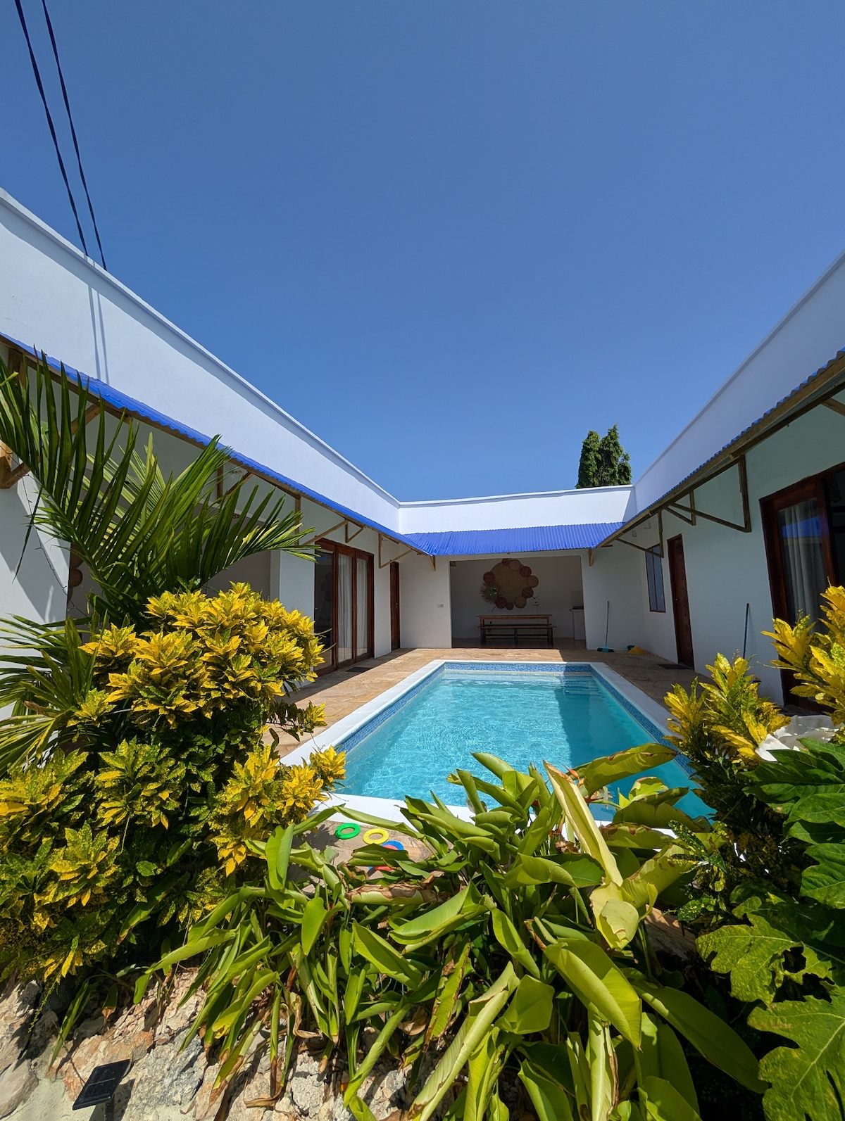 This wonderful house has 3 bedrooms, 2 bathrooms, a big kitchen with an open living and dining area and a wonderful place to sit outside to enjoy the garden and the sunset. Nyumbani, translates into „feel at home“, with locally handcrafted furniture and a real Zanzbarian door the villa invites you to your home on Zanzibar! The most beautiful beaches are only a short walking distance (10-15min) away. It is a very safe area with international neighbors. All rooms are with AC.