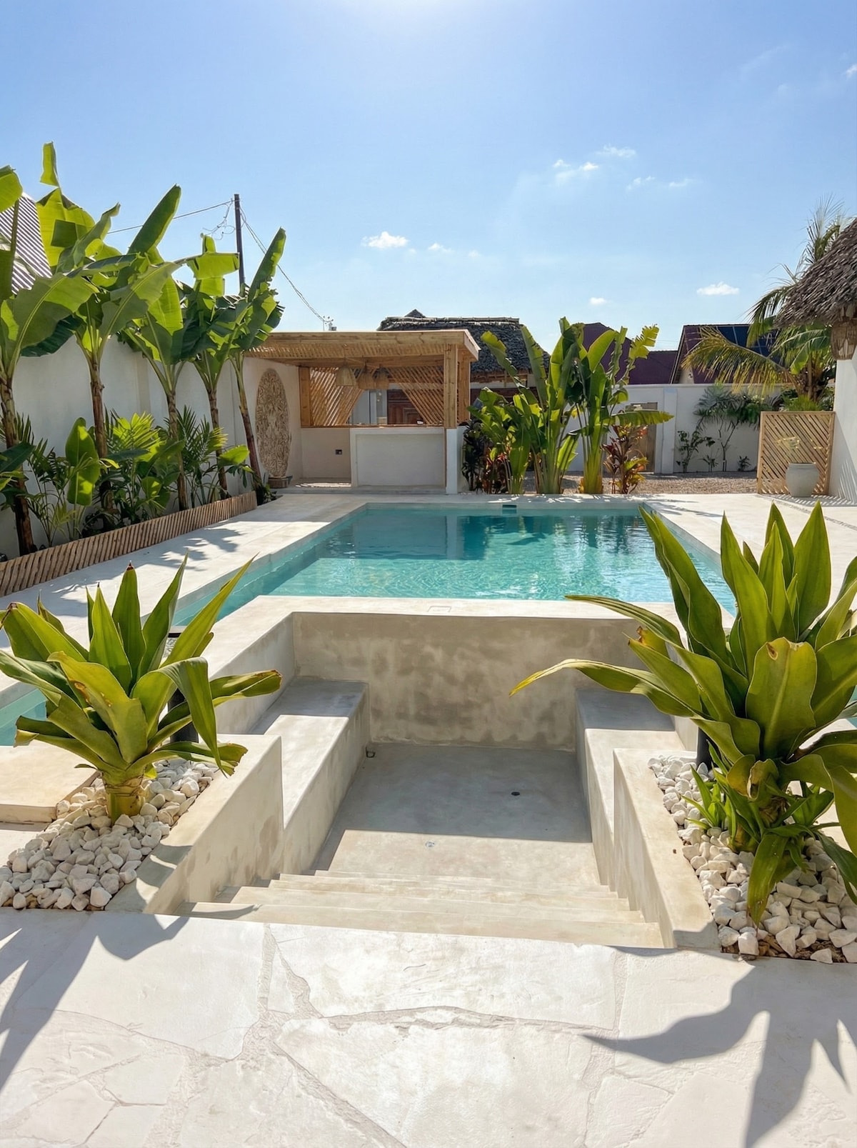 * Villa is private, it has it's own private pool and nothing is shared* Escape to our unique and stylish Bali inspired retreat, nestled amidst the breathtaking beauty of East Nungwi. A place far away from the crowds, where every detail harmonizes with nature. Wake up to the majestic sight of the sunrise, as you find yourself cocooned in lush greenery. Take a plunge into our private pool or simply relax in the midst of this picture perfect paradise. Come, experience the magic of Zanzibar.