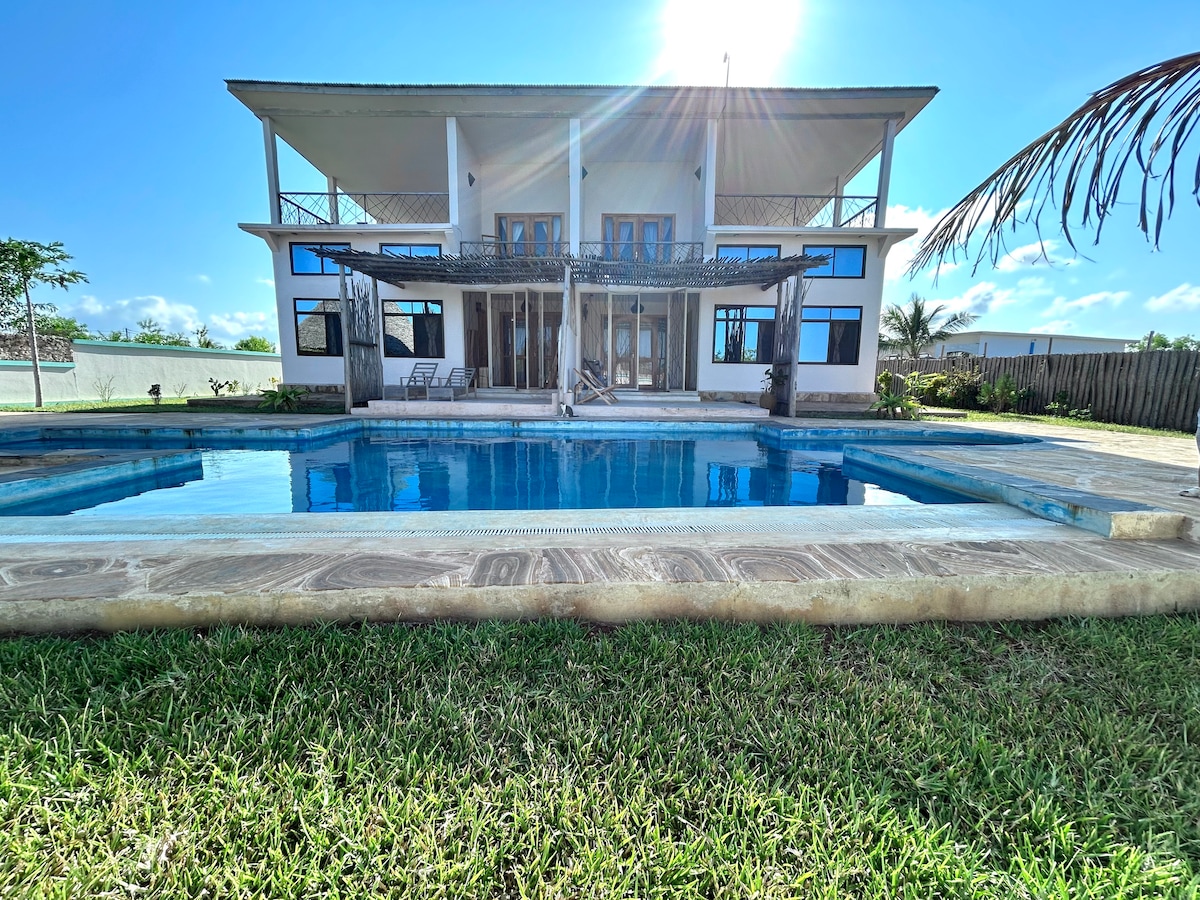 Spacious, very private villa on ground floor perfect for small family or friends. The property is split in 2 separate apartments: 2 bedroom apartment & a cosy 1 bedroom studio apartment together sleeps up to 9 people. Only 1 minute from the Kiwengwa beach. Private parking with direct access to the main road. 10m stunning pool, lush garden, bbq & outside seating, outside shower & toilet, sun beds & umbrellas, cctv & 24h security. A classy and unforgettable oasis with good WiFi.