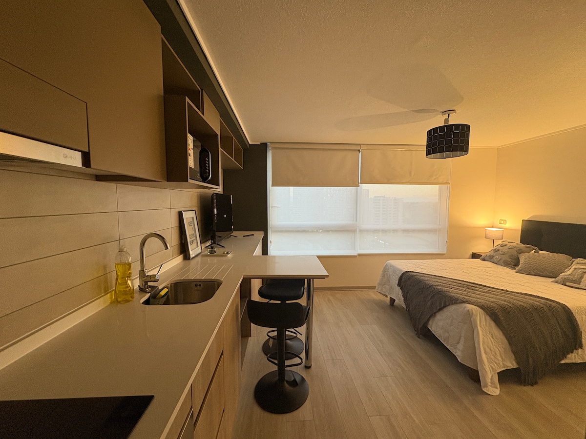 Sorpréndete y déjate cautivar por este moderno departamento en el corazón de Ñuñoa, con ubicación privilegiada, a pasos de centros comerciales, principales avenidas y Metro L3. Con un diseño elegante y detallista, ofrece un amplio dormitorio, balcón privado y todo lo necesario para una estadía cómoda e inolvidable. Full equipado, con WiFi, Smart TV y espacios pensados para tu descanso. Vive la experiencia de un hogar nuevo, moderno y lleno de vitalidad.