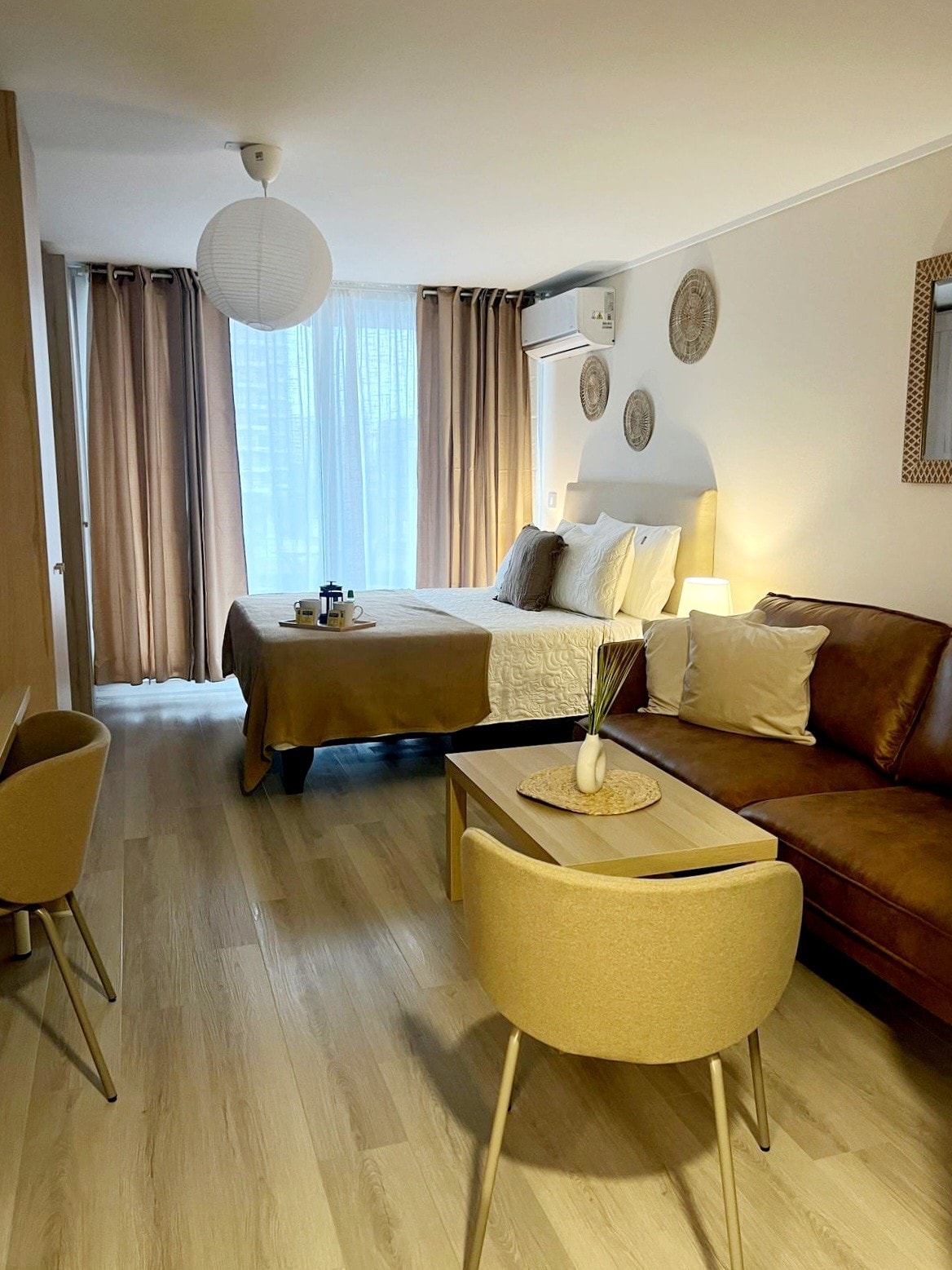 Un espacio luminoso, silencioso y con vista abierta a la ciudad. Inspirado en el estilo japandi, este estudio cuenta con cama Queen, aire acondicionado y una terraza ideal para relajarte o fumar al aire libre. A pasos del Estadio Nacional, centros de entrenamiento y Movistar Arena. Perfecto para eventos, escapadas o estadías tranquilas con diseño natural.