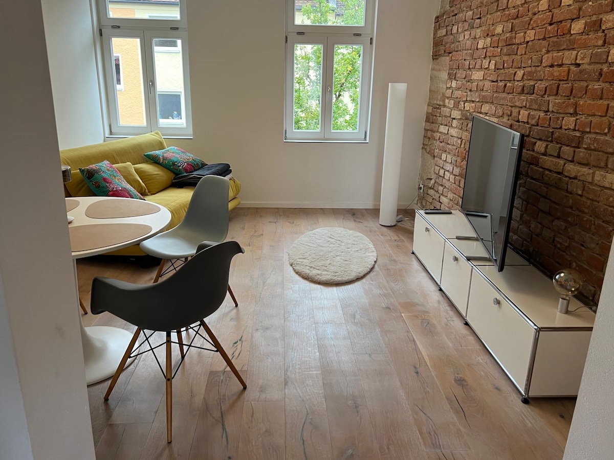 You live in this stylish apartment in a central location (Nuremberg, St. Sebald). The apartment has its own bedroom, a sofa bed in the living area and a bathroom with shower. The highlight is certainly the terrace with a view of the inner courtyard. Location You are in the middle of the old town and yet in a quiet side street. The apartment is easy to reach by car and public transport. In a few minutes you are directly at the main market and all the important sights.