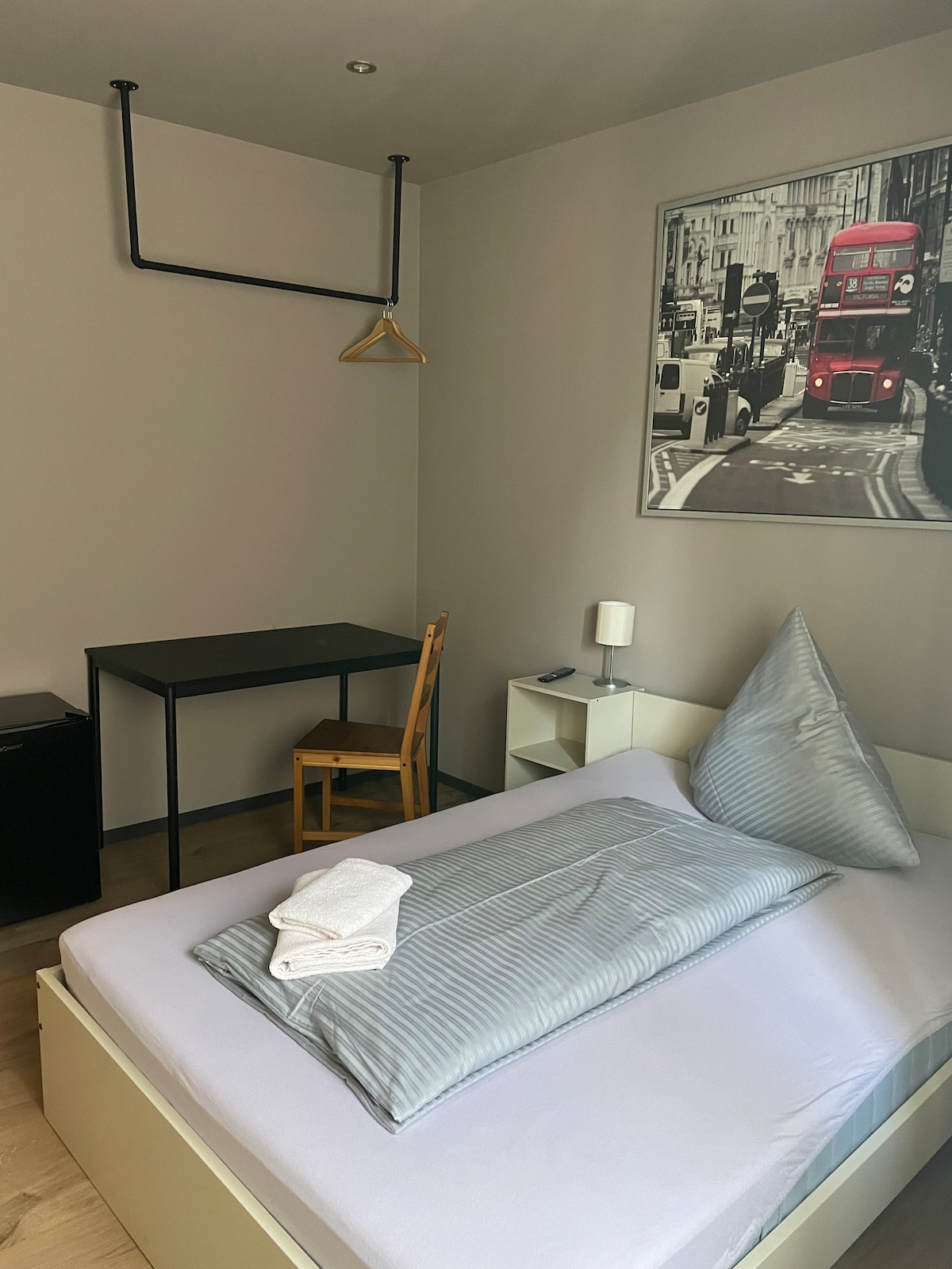 richtiges Einzelzimmer mit privatem Bad, Sat TV Ideal für den Besuch der Messe Nürnberg oder für Monteure, weitere Zimmer bis 10 Pers. auf Anfrage verfügbar Minibar und kleine Küche im öffentlichen Bereich.