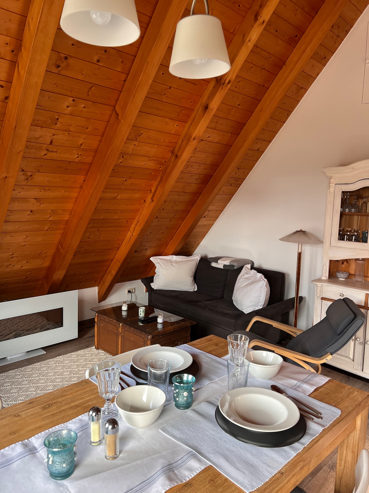 Wohnung, im ersten Stock, zwei offenen Schlafbereichen (keine abgeschlossenen Räume) Kletterdach, Balkone in alle Himmelsrichtungen. Ins Schlafdach führt eine steile Treppe! Das Doppel-Schlafsofa ist allerdings im unteren Wohnbereich. Gartenanteil mit Feuerstelle, Außensauna. Voll ausgestattet Küche, mit Gasherd.. Gewürze sind vorhanden, Kaffee müsst ihr selber mitbringen. Im Sommer wird das Brauchwasser über die Solaranlage erwärmt. Es kann etwas dauern bis bei Wolken die Heizung anspringt.
