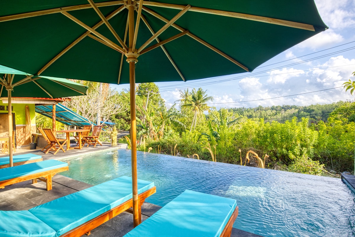 Stay in the heart of Nusa Penida, secluded within Bali's bird conservation, with flocks of birds singing over you! & surrounded by 100-year-old trees! Enjoy your stay in a unique-charming room with a pool, & outdoor-indoor shower! Only 200m from Nusa Penida's most famous area of restaurants, bars, and beach clubs & dive centers! Only a few walking distances to a pristine beach overlooking Mount Agung with beautiful coral scenery perfect for diving & snorkeling.