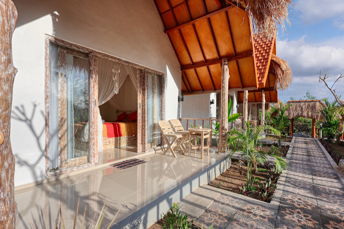 Garden View at Peaceful Hill Penida is a cozy tropical cottage surrounded by lush greenery, offering stunning views of the garden and peaceful hills. Designed with natural bamboo elements and modern touches, it provides a tranquil escape perfect for couples or solo travelers. Located just a short drive from Nusa Penida's must-visit spots like Kelingking Beach and Crystal Bay, it’s an ideal base for exploring the island or simply relaxing in nature.