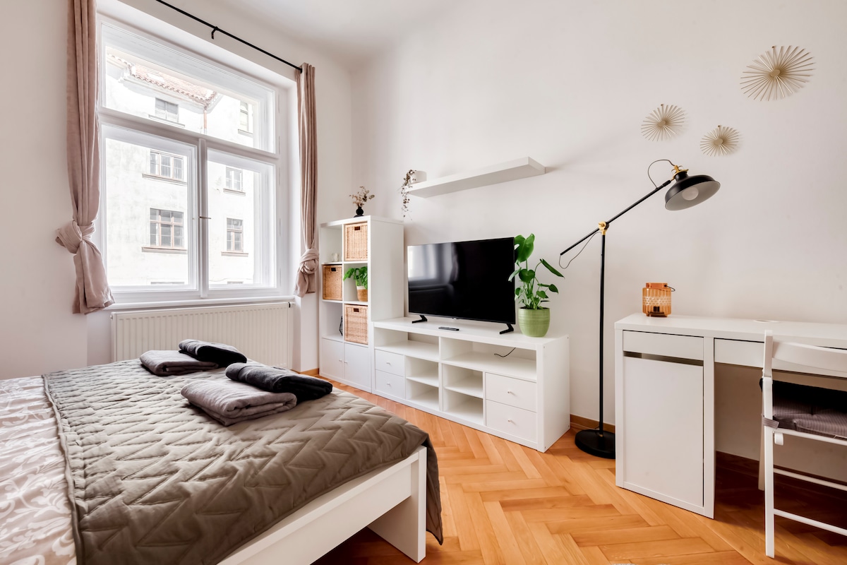 Bright & modern studio apartment near Vyšehrad castle Welcome to our beautifully designed studio, perfect for a comfortable and convenient stay. This modern space is ideal for solo travelers or couples looking to explore the city while enjoying the comfort of home.