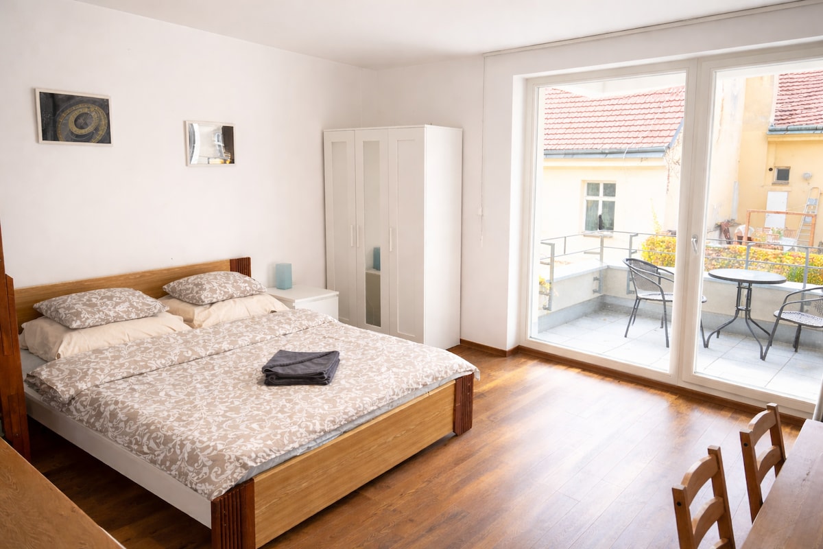 Discover this newly renovated apartment, which offers an ideal living space with all the necessary comforts. The bedroom, flooded with natural light, is equipped with a comfortable king-size bed for peaceful nights. The bedroom opens onto a balcony with a view of a majestic chestnut and bamboo tree and Vitkov Hill with the statue of Jan Zizka and a national monument. The kitchen is modern and fully equipped, perfect for preparing your meals. The bathroom has a large walk-in shower.