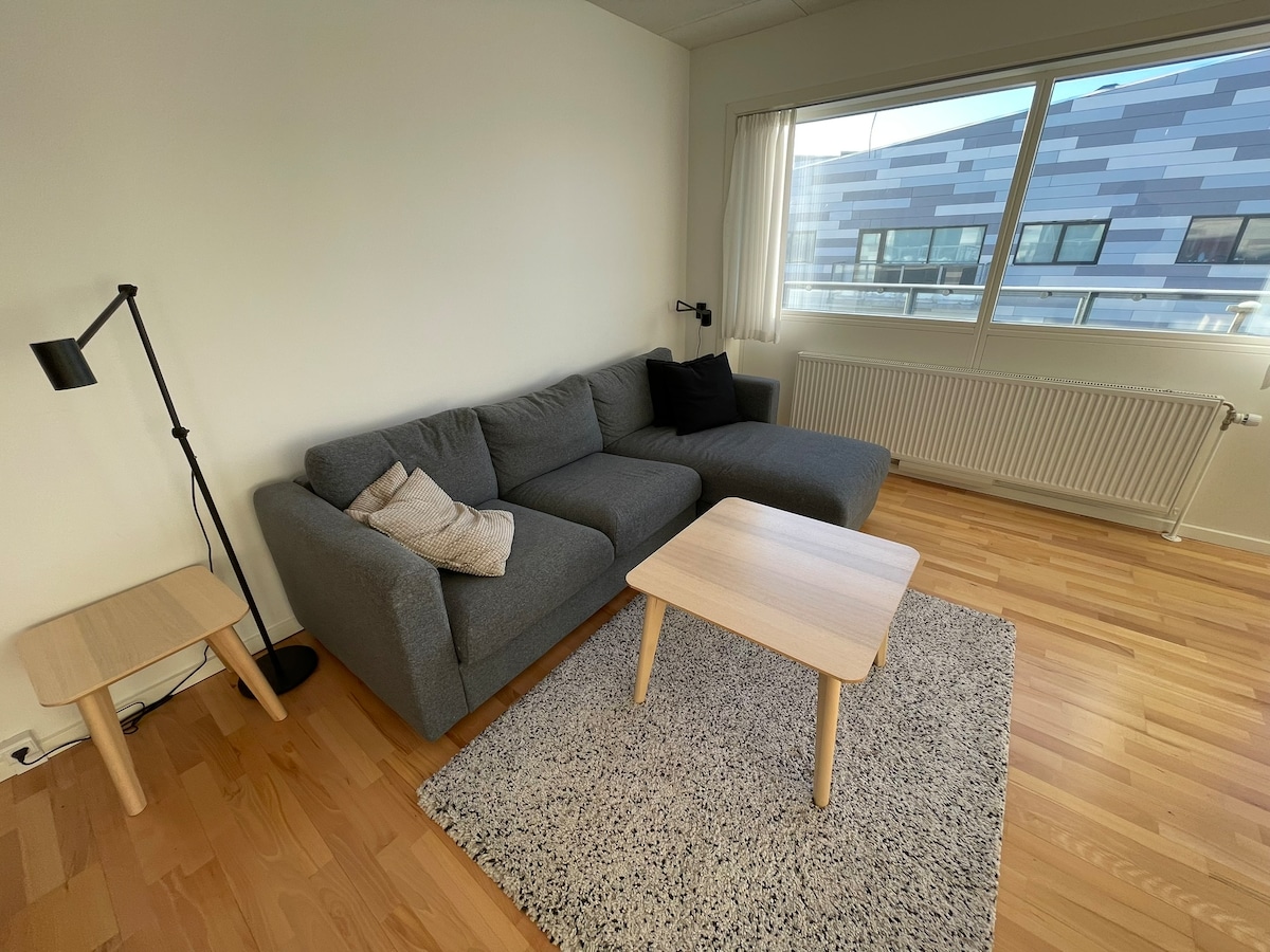 In quiet surroundings by the water in a good neighborhood. 5 min walk by the water and you enter to museum, cafe and restaurant. Or if you walk up the road hill you enter the city. There is instant coffee, tea and sugar to get you an great start in the morning. There are washing machine soap, and drying rack to put outside for drying. Remember the air here is very dry. We live upstairs with our 3 kids. Smoking by the building it forbidden, smoking can happen away from the building.