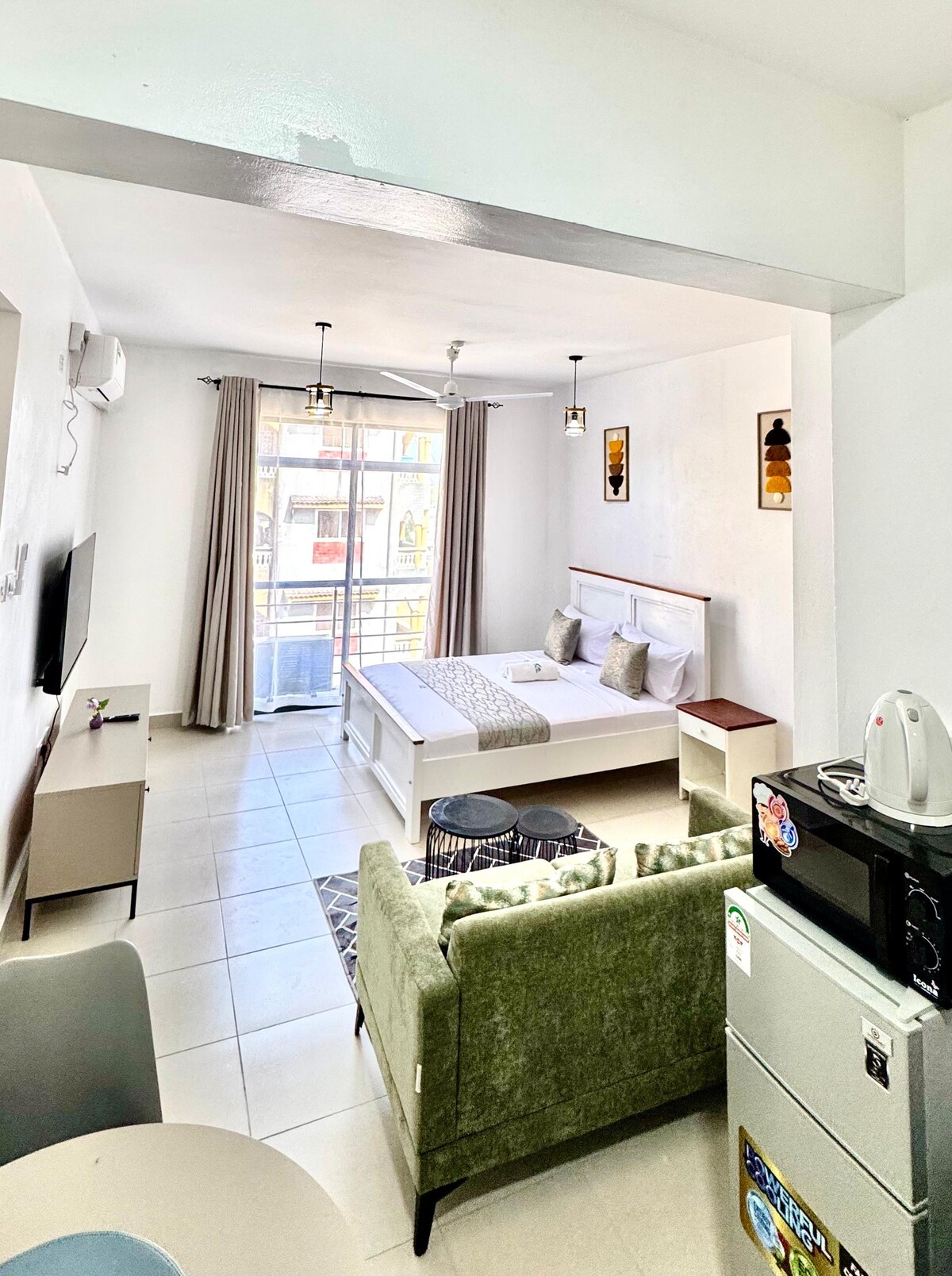 Discover this modern, newly finished studio in the heart of Nyali—perfect for two. Enjoy a balcony with stunning ocean views, sleek contemporary interiors, and all essential modern amenities. Relax at the rooftop infinity pool or stay active in the gym overlooking the ocean, offering one of the best views in the area. Inside, the studio features a comfortable bed, a stylish kitchenette, high-speed Wi-Fi, smart TV, and a chic bathroom.