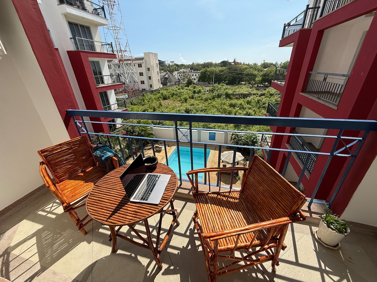 A cozy serviced studio apartment (Bamburi) furnished *Suitable for 2 adults and 1 child or 3 adults, furnished with a queen size bed and a single bed *Daily cleaning included *Dining table with four chairs, sofa, coffee table *AC *TV *Lock up safe *Balcony-two chairs, coffee table *Kitchen - fridge, microwave, kettle, coffee maker, toaster, crockery, cutlery *Access to amenities - pool, kids play area, beach bar, restaurant, gym, beach, laundry *21 km from Moi Int airport *26km from SGR Mombasa