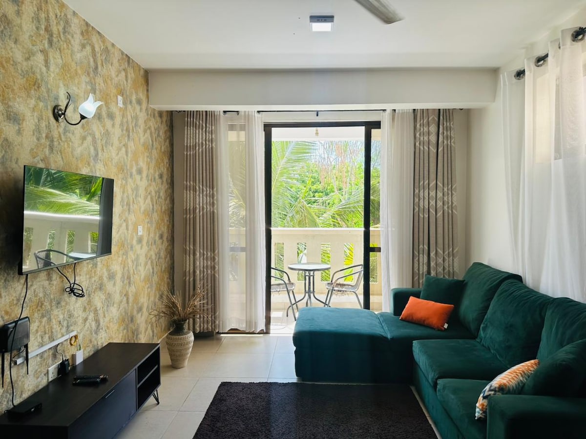 A cozy serviced studio apartment (Bamburi) furnished *Suitable for 2 adults and 1 child or 3 adults, furnished with a queen size bed and a single bed *Daily cleaning included *Dining table with four chairs, sofa, coffee table *AC *TV *Lock up safe *Balcony-two chairs, coffee table *Kitchen - fridge, microwave, kettle, coffee maker, toaster, crockery, cutlery *Access to amenities - pool, kids play area, beach bar, restaurant, gym, beach, laundry *21 km from Moi Int airport *26km from SGR Mombasa