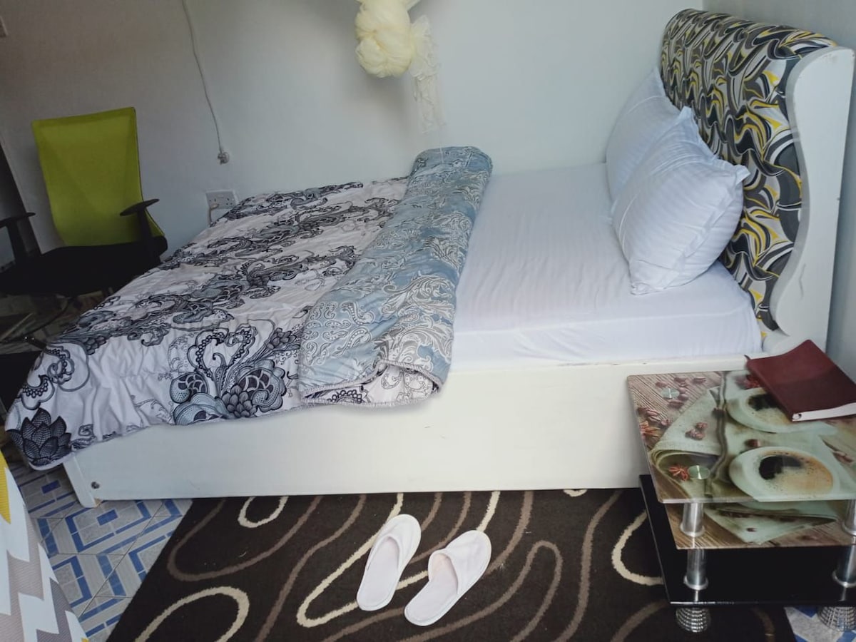 Indulge in urban luxury at our centrally located studio, featuring a lavish king-size bed. Situated in the quiet and safe Nanyuki town, few minutes walk from the vibrant Cedar Mall, our premise offers a range of amenities, including a refreshing pool, a river bank, camping, picnic site with lots of mature trees and greenery , – all within a beautifully landscaped garden. Plus, enjoy entertainment on our impressive 55" TV with a complimentary Netflix subscription.