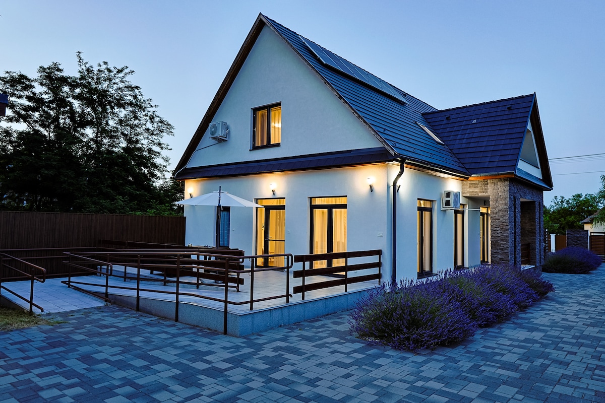 Discover a serene escape for your entire family at this peaceful home. This spacious house features a large yard, perfect for enjoying green grass and beautiful trees, or for playing on the paved area. Conveniently located just minutes from the supermarket, and a short 10-minute drive from the Zoo and Aquapark, this cozy house is an ideal choice. It comfortably accommodates up to eight guests and offers parking for two cars in the yard.