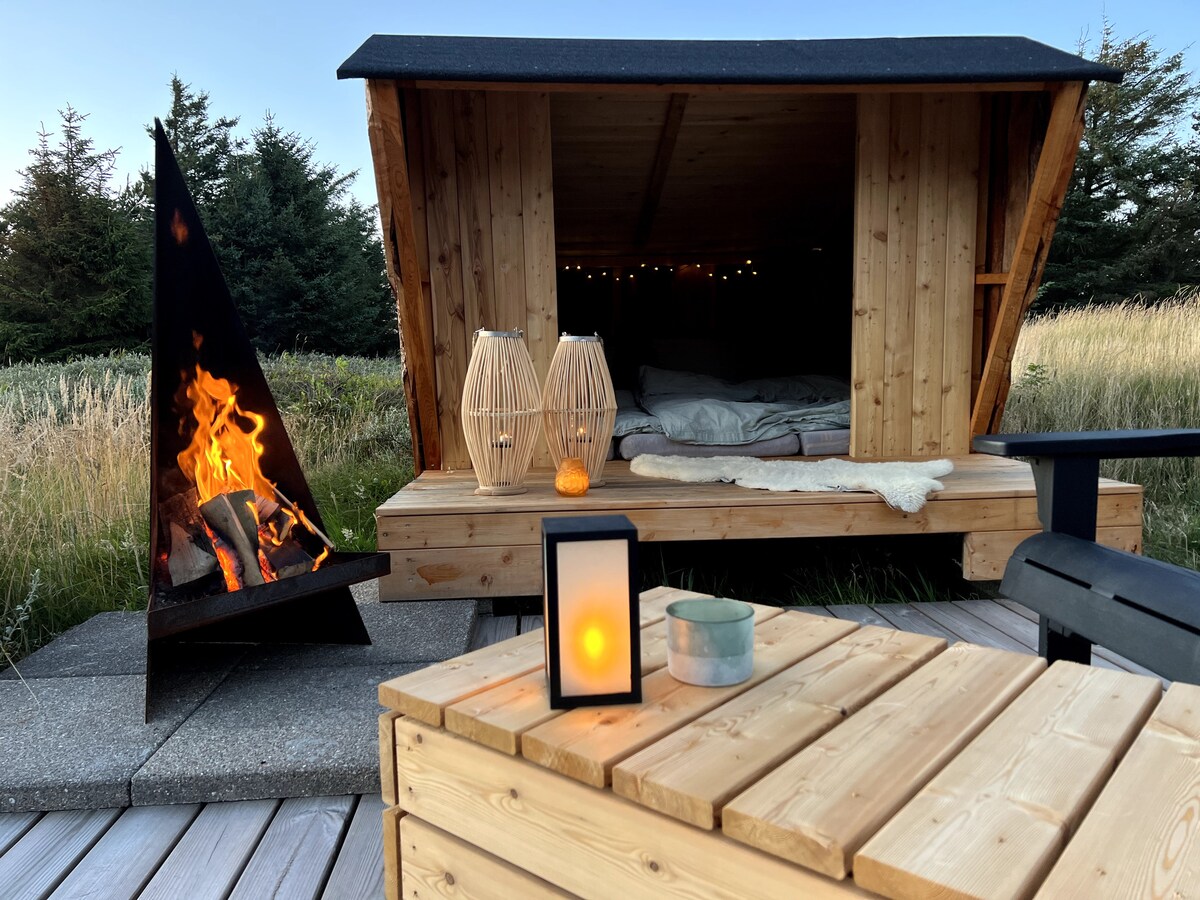 Her kan I være et med naturen i og omkring et lille stilfuldt indrettet sommerhus på 35 kvm. indrettet med alkove og hems. Omkring huset er der terrasser med saunatønde, udendørs bruser, udekøkken med gasgrill og pizzaovn, bålsted og shelter. Det betyder, at sommerhuset er lige anvendelig som "lovenest" for et par, der ønsker at nyde tosomheden i hyggelige omgivelser som for venner, som kan lide udelivet måske oven i købet med udendørs overnatning.