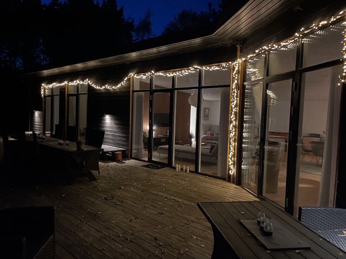 Velkommen til vores luksus feriehus i nordisk stil på 181 m² med plads til 10 gæster. Vi hedder Anders og Stine. Udendørs byder huset på en stor terrasse med privat vildmarksbad, sauna og udebruser. Indendørs findes biograf, billiard, bordtennis og bordfodbold - perfekt til både afslapning og sjov. Herudover 5 rummelige soveværelser samt et fuldt udstyret køkken. Naturoplevelser i topklasse med 300m. til skoven og 2 km til Danmarks bedste badestrand. Vi glæder os til at byde jer velkommen.