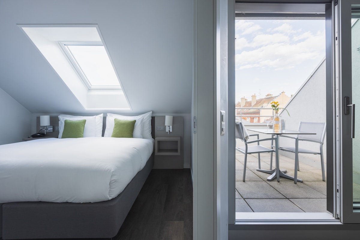 This spacious apartment offers a 7 m² private terrace, a separate living room with sofa bed, coffee table, reading light, 102 cm connected TV, desk with sockets, and a bedroom with dressing room and 81 cm TV. Free Wi-Fi connection. The fully equipped kitchen features a large dishwasher and Nespresso coffee machine. The bathroom includes a rain shower and heated towel rail. The large picture windows are fitted with blackout blinds for added privacy.