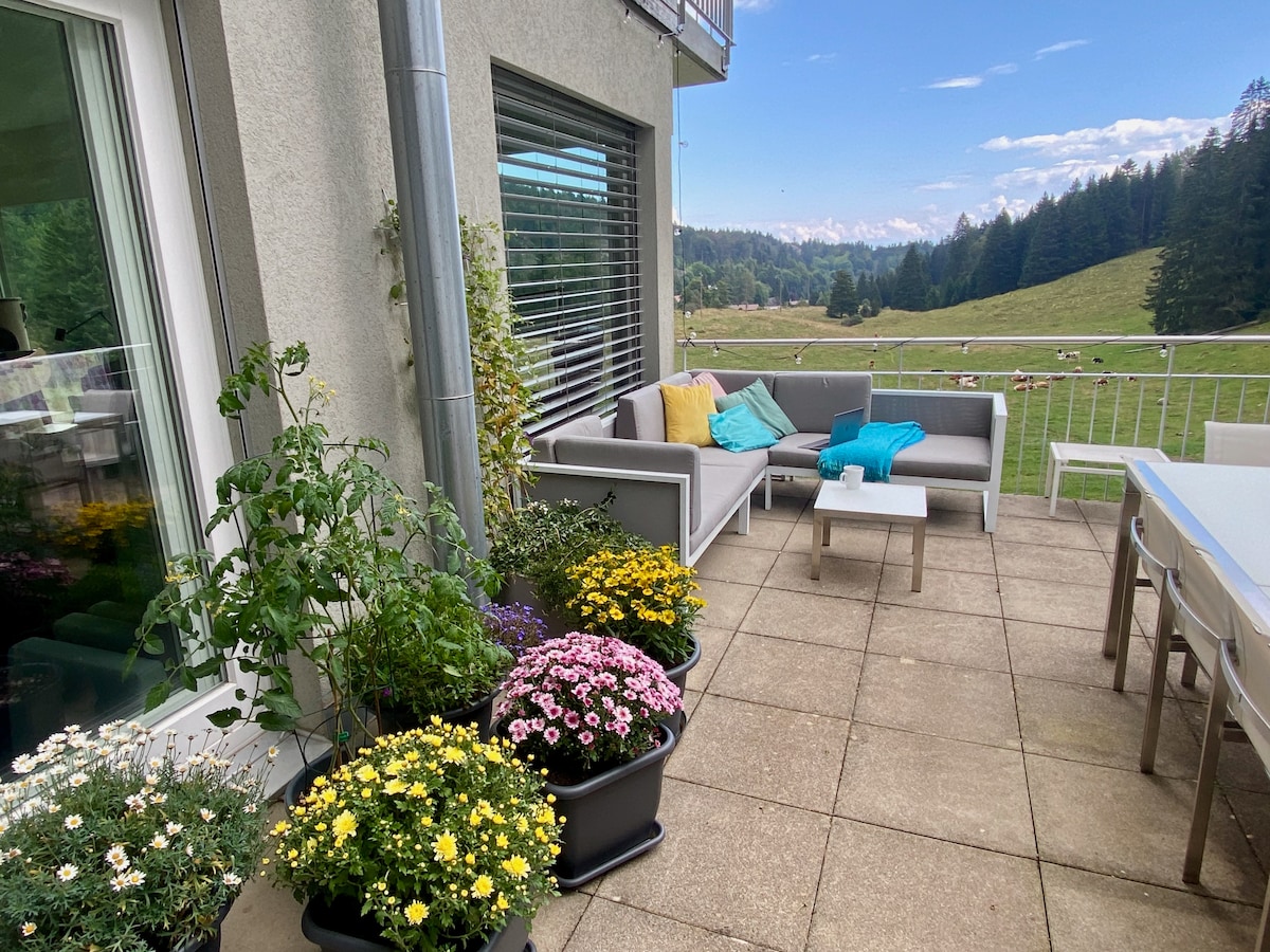 公寓很棒,有花园和阿尔卑斯山的美景