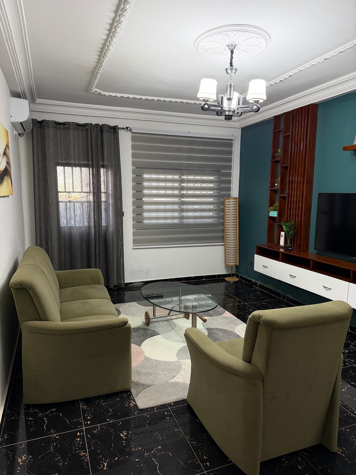 Profitez en famille de ce fabuleux logement qui offre 1 grand séjour, 2 grandes chambres,2 douches avec eau chaude,2 balcons,un grande cuisine équipée, sécurité H24 avec caméra de sécurité dans un quartier très calme loin des bruits du centre ville. situé à 30 mn de l'aéroport NSI,30 mn du Centre ville. Femme de ménage à votre disposition .
