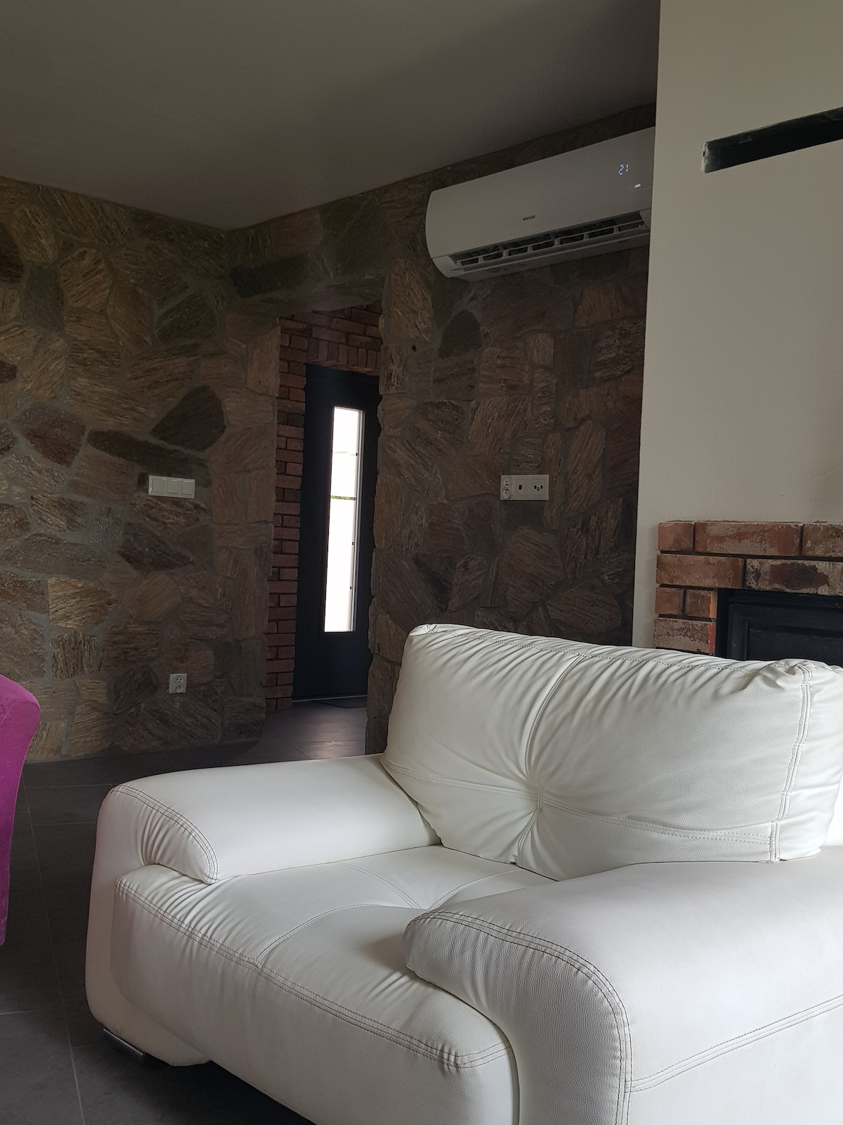 The right part of the cottage, looking from the road. This part is sunnier, usually more popular with guests. In each of two parts there is a one-floor appartement 4 + kitchen corner + 2 WC + bathroom, private Sauna, of a total floor surface of 120m2. In the 3 bedrooms there are 7 regular beds (1st bedroom double bed, 2nd bedroom 2x single bed, 3rd bedroom 2x single bed + sofa) + 2-4 beds on the sofa bed in the living room. Wallbox Copper is available (paid service = € 0,25/kWh)