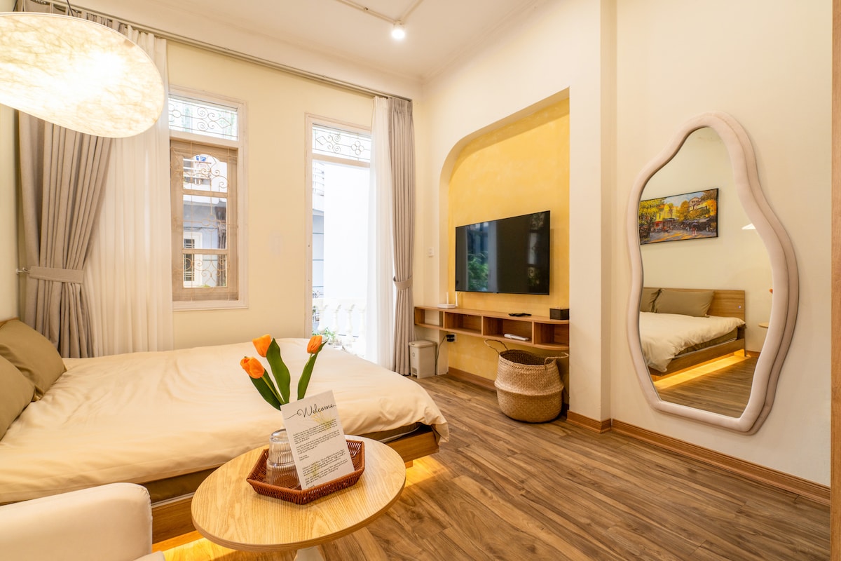 Enjoy Hanoi’s Old Quarter from a modern retreat just steps from the iconic TRAIN STREET. This apartment features a SUPER KING SIZE BED, A COMFORT SOFA, and luxury bathroom with shower and WOODEN BATH TUB. Cook in your PRIVATE KITCHEN and unwind with the 100-INCHES PROJECTOR and Wi-Fi. A LARGE SOUNDPROOF WINDOW offers lively street views, blending Hanoi’s charm with home comforts. Ideal for travelers seeking a unique and tranquility stay in the heart of the city.
