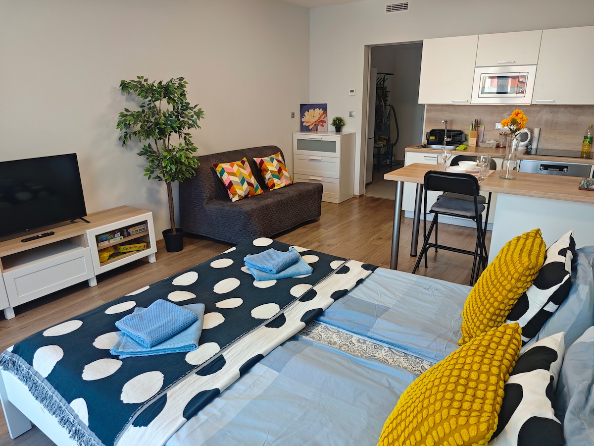 A great, light and bright sunny 1 bedroom apartment with roof terrace (south facing), many local shops and restaurants within easy reach, and the metro for the city centre just moments away. The local park behind the house has running tracks , woodland walks and a stream running through it. As well as having good connection to the tourist centre by metro in less than 7 minutes, the apartment is located just minutes walk to the o2 Arenas , and many of the medical tourism clinics in the area.