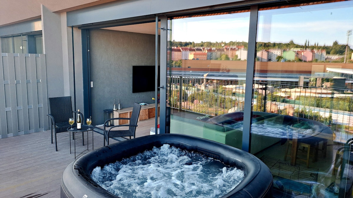 Marina Boulevard Penthouse with 110sqm apartment with large terrace with BBQ. All just 8minutes from the city center. A perfect holiday get-away or home office for the traveler. Marina Boulevard Penthouse is located in Prague 8 in a private housing area. Situated on the Banks of the Vltava River with secluded walks to the City center via green parks or to Prague's largest park 'Stromovka' along the river north. 2 minutes from Libensky Most Tram stop or 5 minutes to Palmovka Metro.