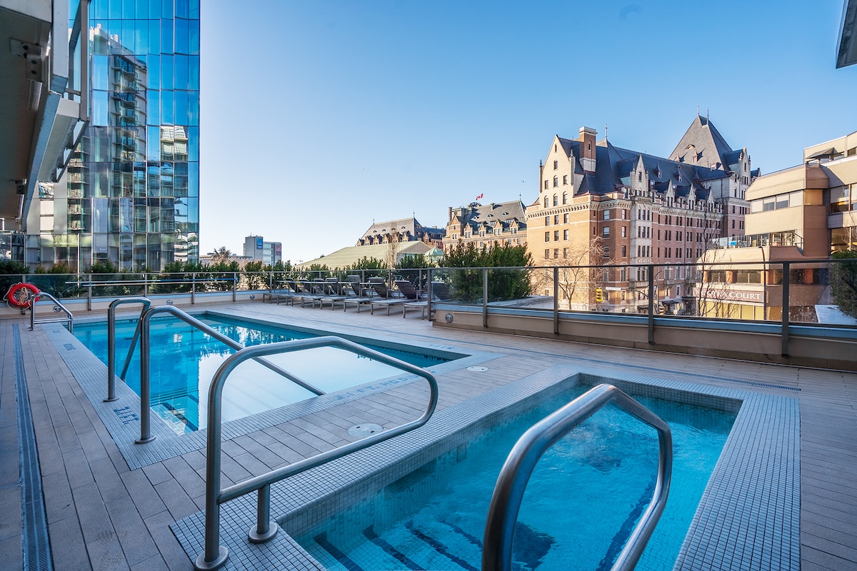 Welcome to your modern boho retreat in the heart of Downtown Victoria! Perched on the 15th floor, this bright and stylish 1-bedroom, 1-bath condo offers stunning panoramic views of the ocean, mountains, and city skyline. Enjoy floor-to-ceiling windows, a cozy private balcony, and curated decor that blends warmth with a modern touch. Step outside and explore Victoria’s best cafes, shops, and restaurants just steps from your door — then come home to FREE Parking, comfort, and calm above it all.