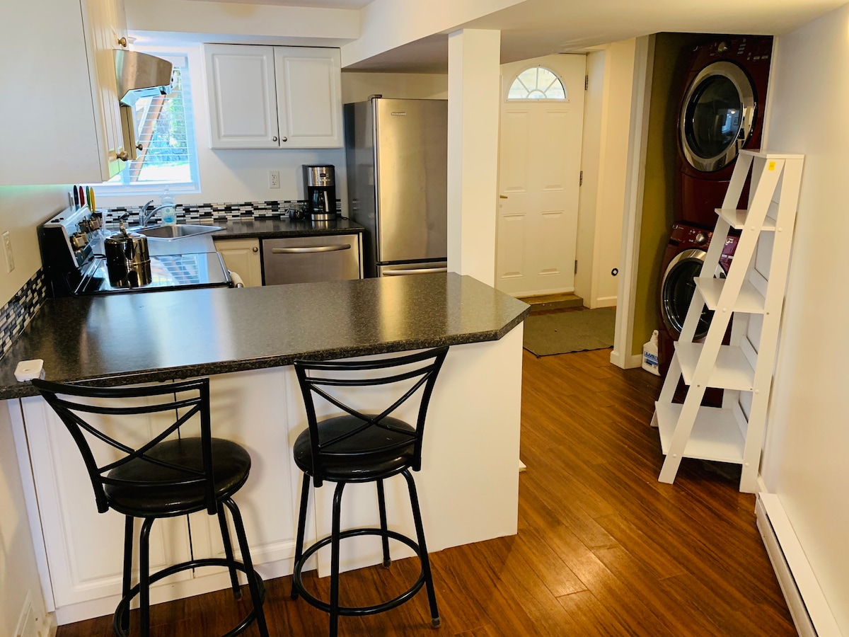 Bright, updated and clean 2 bedroom suite. Full kitchen with dishwasher and in-suite laundry. Kitchen is equipped with everything needed (cutlery, dishes, mugs, glasses, coffee maker, etc.) Neighbourhood is a lovely quiet pocket right in the middle of it all! Additional note: this is a downstairs suite in our home, so you may hear footsteps of us living in the main floor portion of the house.