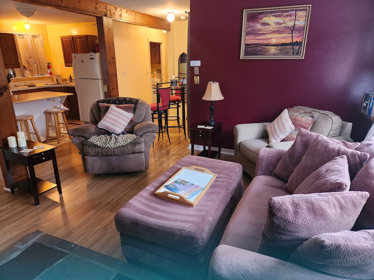 3rd fl Waterfront Oak Bluffs Harbor Penthouse- Sleeps 2 comfortably-3 in a pinch. (356sqft) . Queen bed & a reclining futon couch. With kitchenette & amazing harbor views, you cannot get closer to harbor, unless you fell in. Located above a seasonal restaurant, with 5 open air restaurants (2 on each side, & were in the middle with our restaurant Lobsterville Bar & Grille below)