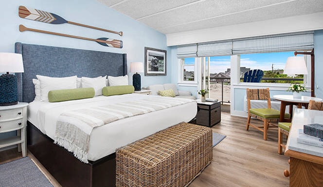 The three (3) King Deluxe rooms at our boutique Edgartown hotel can accommodate two total guests each. Varying from 245-280 square feet each, one is located on the second floor adjacent to The Richard and King Suites (great for groups traveling together). Each room offers a plush king bed, and each its own unique style and function. All of these rooms also offer a 43" LED Smart TV, a safe, blackout shades, and USB outlets, in addition to individually-controlled AC and free wireless internet.