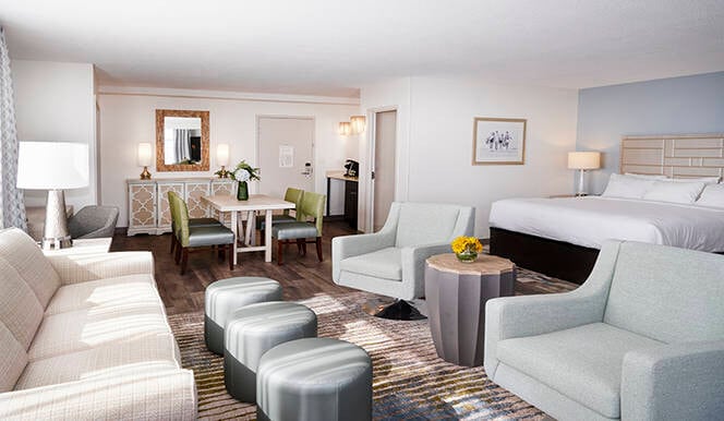 The Coonamessett offers two (2) comfortable 1st-floor King junior suites that are both ADA accessible. One large space features a plush king bed and a lounge/sitting area with a sofa and dining table as well as a private bath with a walk-in shower. These 475-510 square foot rooms also include a 43" Smart TV, Bluetooth radio, mini-fridge, individually-controlled AC and heat (window AC units used in the warmer months), and free wireless internet access.