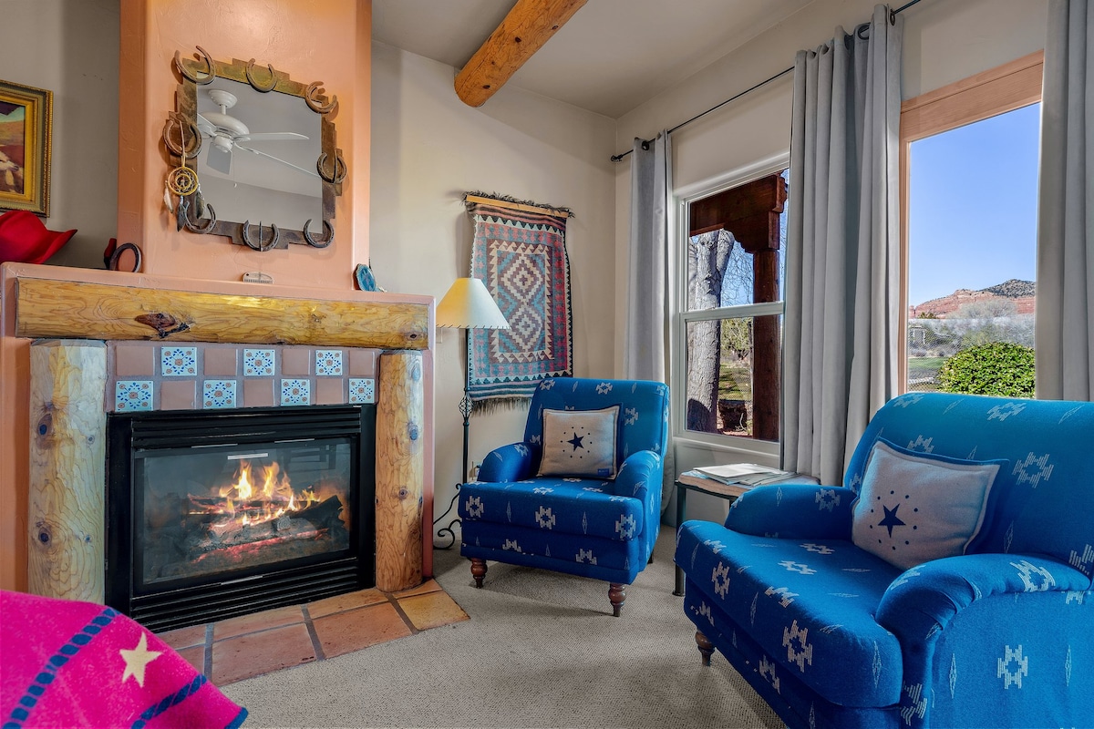 Located adjacent to the main building, the villa boasts the same appealing features as the standard and studio rooms but are larger and come with a spacious private patio overlooking the Red Rocks. The room has one queen-size bed, a living area with a fireplace, and a small kitchenette. You won’t want to leave this charming, one-of-a-kind place. Jacuzzi tub and fireplace make this the couple's destination you've been looking for in Sedona. Warm and inviting, private and secluded.